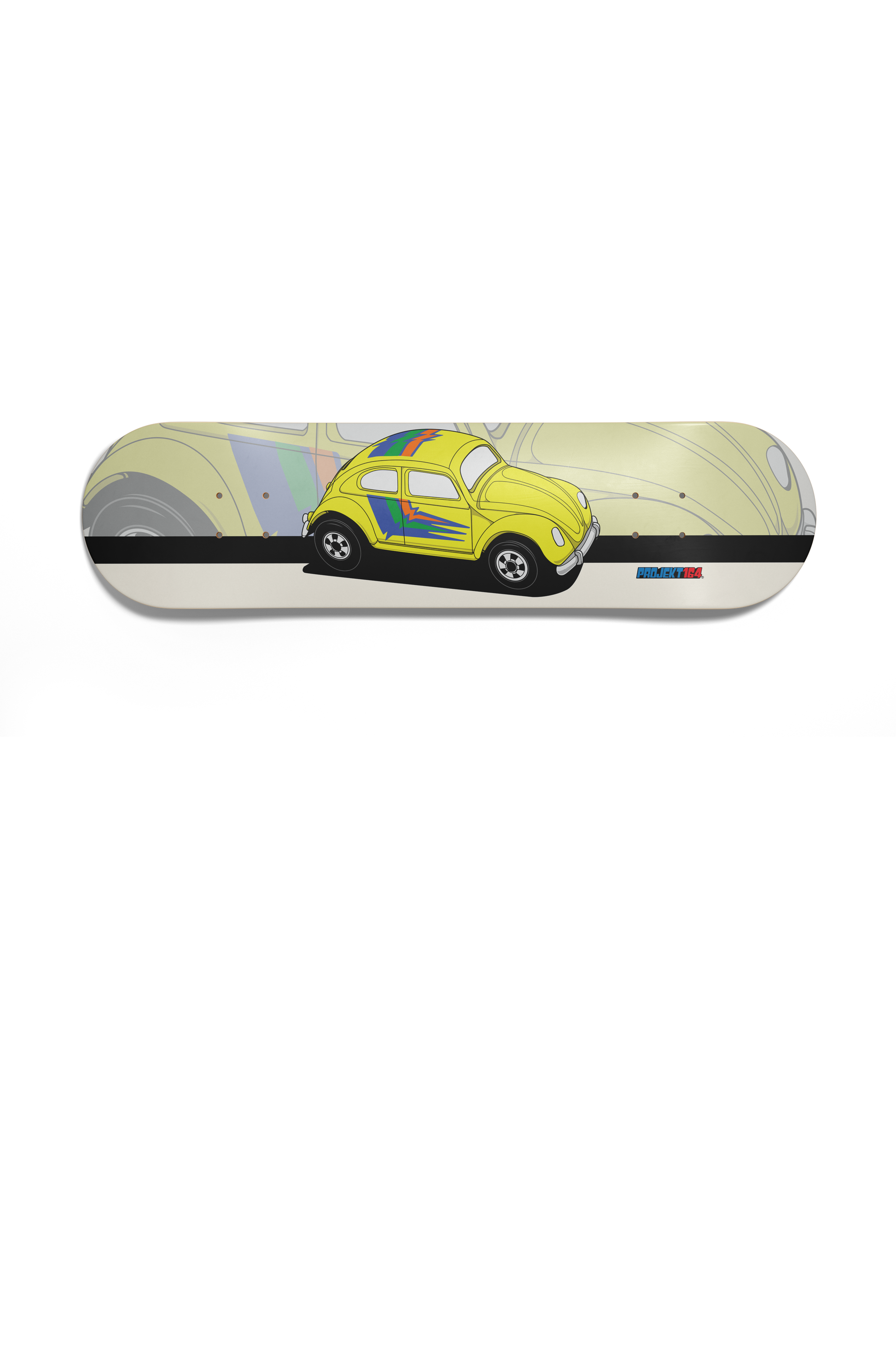 This VW bug is a perfect way add a cool factor to any garage or man cave. A must have for any diehard Volkswagen enthusiast. Art is a Projekt 164 original and printed on the bottom of each deck with assorted color veneered top.